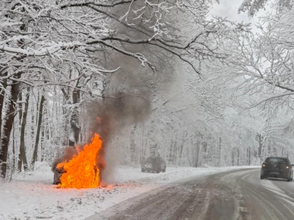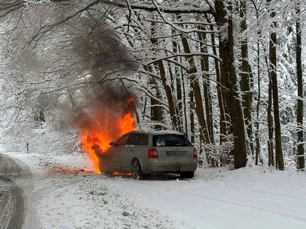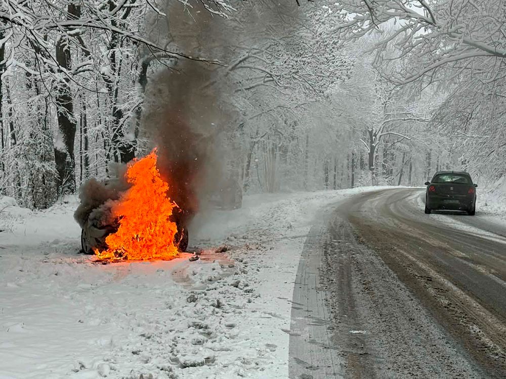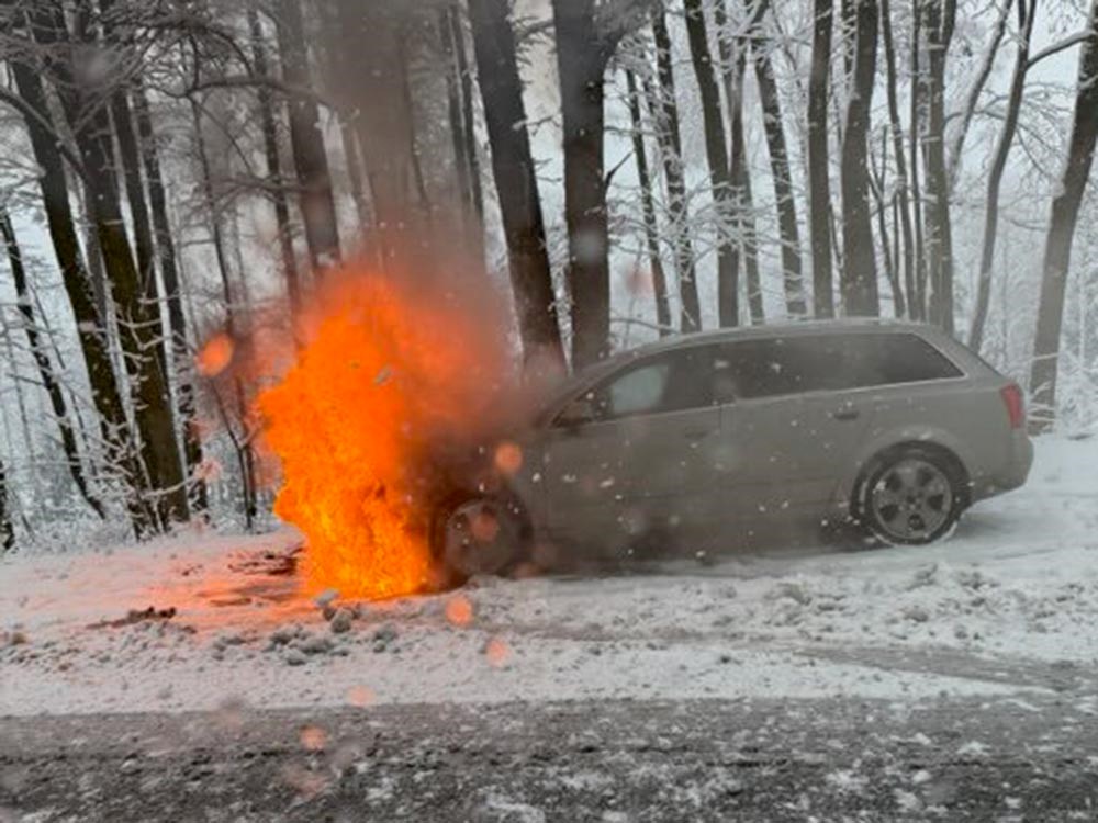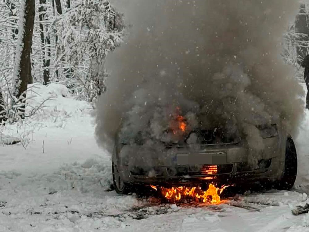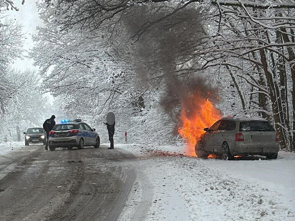 Do niebezpiecznego zdarzenia na drodze doszło w środowy, śnieżny poranek. Kilkanaście minut przed godziną 10. Dyżurny Powiatowego Stanowiska Kierowania Państwowej Straży Pożarnej otrzyma zgłoszenie o pożarze samochodu stojącego na przydrożnym parkingu na drodze wojewódzkiej pomiędzy Płóczkami a Gradówkiem.