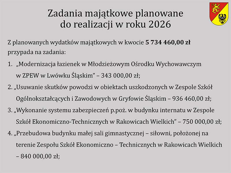 Z planowanych wydatków majątkowych, kwota 5 734 460,00 zł, przypada w roku 2026 na następujące zadania: