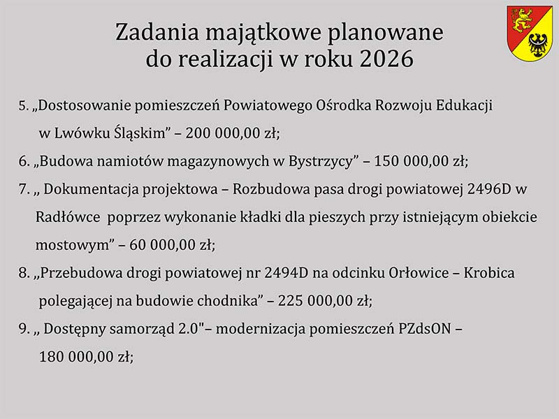 - “Dostosowanie pomieszczeń Powiatowego Ośrodka Rozwoju Edukacji w Lwówku Śląskim” – 200 000,00 zł;
