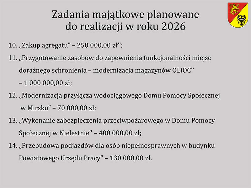 - “Modernizacja przyłącza wodociągowego Domu Pomocy Społecznej w Mirsku” – 70000,00 zł;