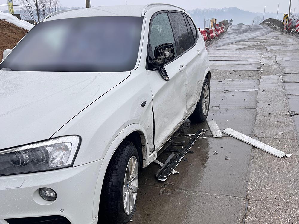Do kolizji doszło dziś rano na ulicy Betleja w Lwówku Śląskim, na objeździe budowanego mostu. Po zderzeniu z BMW bus wypadł z drogi i zawisł na skarpie.