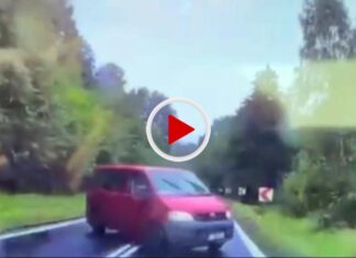 Na nagraniu zarejestrowanym przez samochodową kamerę umieszczona w samochodzie widać, jak jadący w kierunku Jeleniej Góry bus VW ...