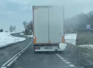 Jechał beztrosko, a z dachu naczepy spadały tafle lodu. WIDEO