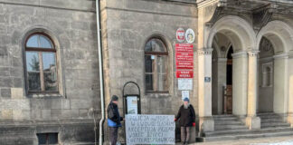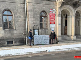 W czwartkowe przedpołudnie przed Urzędem Gminy i Miasta w Lwówku Śląskim pojawiły się osoby z transparentem. W ten sposób demonstrują swoje poglądy.