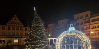 W Mikołajki zaświeciły się ozdoby na lwóweckim rynku. Choinka zasilana specjalną Ławką Solarną oraz wielka bombka.