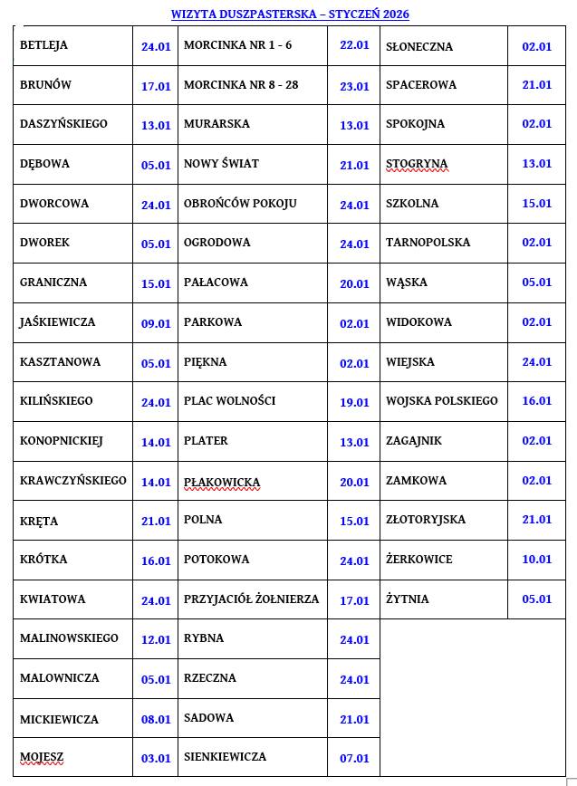 „Od 2 stycznia 2026 roku pragniemy rozpocząć Wizytę Duszpasterską tzw. Kolędę. Przechodzimy do Was z modlitwą i błogosławieństwem Waszych domów i domowników. Porządek kolędy jest następujący: