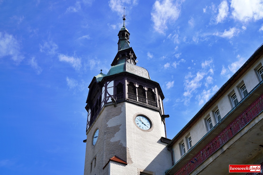 Charakterystycznym elementem budynku stała się wieża zegarowa o wysokości 46 metrów, a jego największym skarbem po dziś dzień pozostaje modrzewiowa Hala Spacerowa o długości 80 metrów. Przy wejściu do Hali bije źródło radonowo-żelazistej wody pitnej.