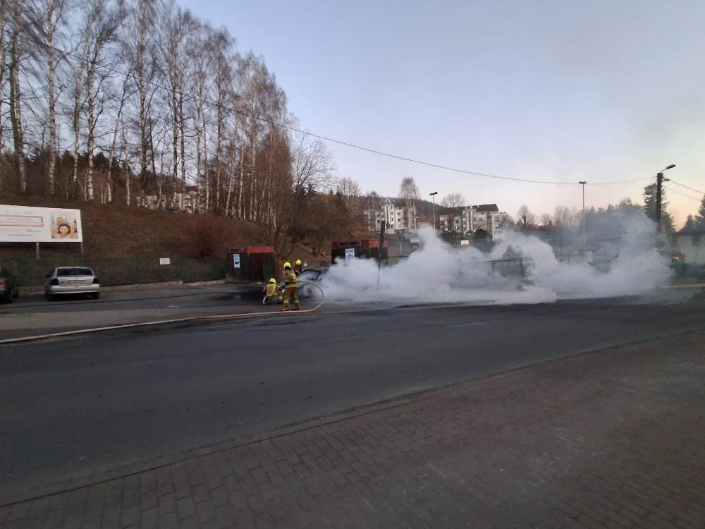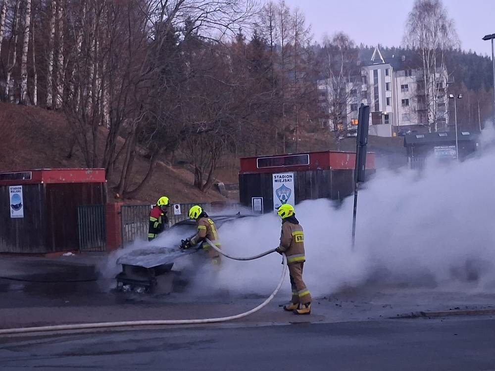 Do kolejnego pożaru samochodu doszło w środowy poranek. Kilkanaście minut po godzinie 7. Dyżurny Powiatowego Stanowiska Kierowania Państwowej Straży Pożarnej w Lubaniu otrzymał zgłoszenie o pożarze auta zaparkowanego przy stadionie miejskim w Świeradowie- Zdroju.