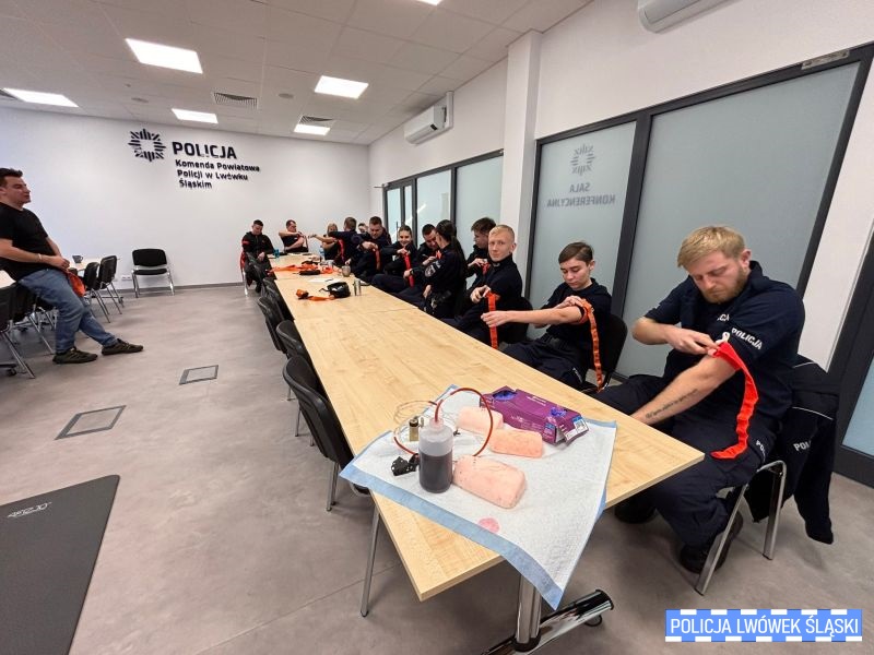 Wczoraj w Komendzie Powiatowej Policji w Lwówku Śląskim odbyło się specjalistyczne szkolenie z zakresu pierwszej pomocy, ze szczególnym naciskiem na tamowanie masywnych krwotoków. W zajęciach wzięli udział policjanci oraz pracownicy cywilni komendy, a szkolenie poprowadzili wykwalifikowani ratownicy medyczni Piotr Bednarek, instruktor m.in. programu „Stop the Bleed” oraz Zbigniew Faryniarz.