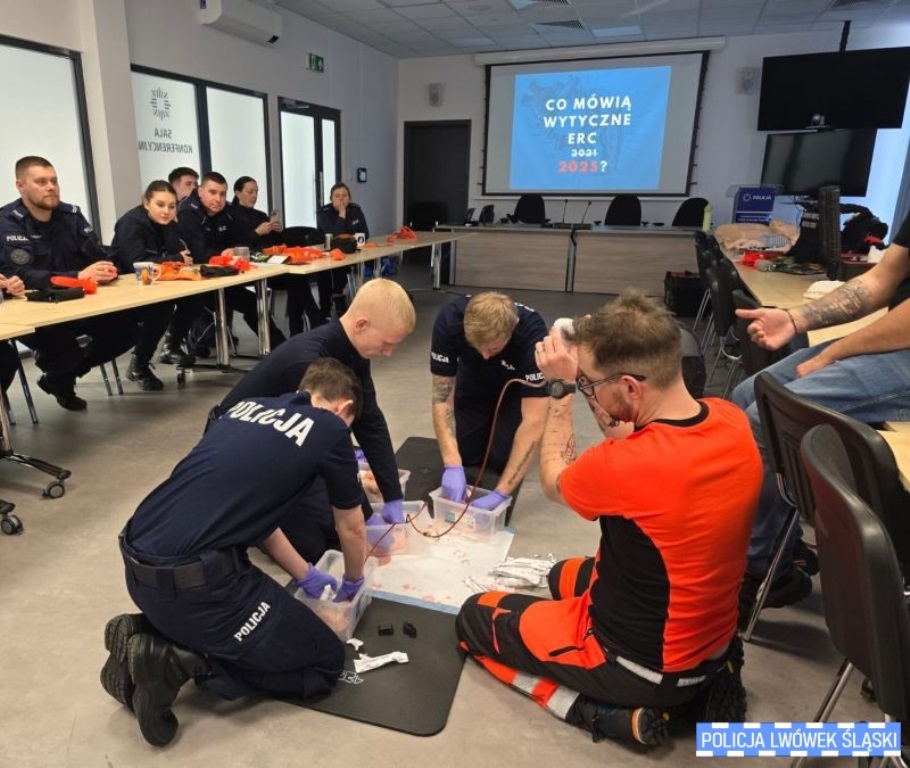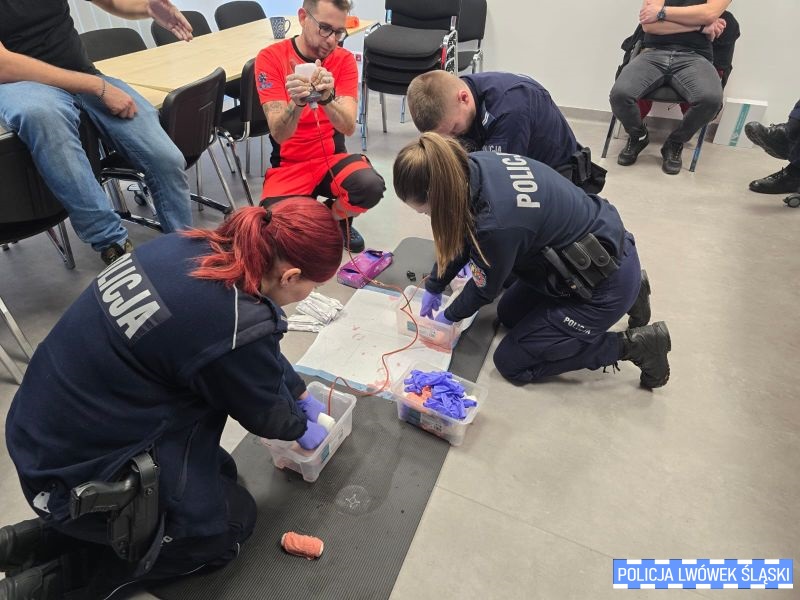 Wczoraj w Komendzie Powiatowej Policji w Lwówku Śląskim odbyło się specjalistyczne szkolenie z zakresu pierwszej pomocy, ze szczególnym naciskiem na tamowanie masywnych krwotoków. W zajęciach wzięli udział policjanci oraz pracownicy cywilni komendy, a szkolenie poprowadzili wykwalifikowani ratownicy medyczni Piotr Bednarek, instruktor m.in. programu „Stop the Bleed” oraz Zbigniew Faryniarz.
