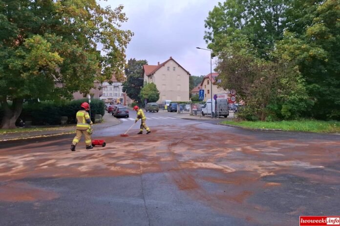 Działania polegały na zabezpieczeniu odcinka drogi, wprowadzeniu ręcznego kierowania ruchem oraz zasypania środkiem sorpcyjnym pokrytego olejem odcinka jezdni a następnie oczyszczenia jezdni.