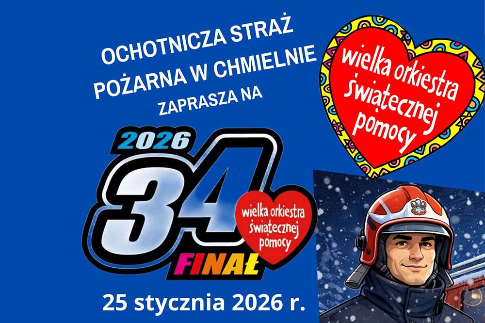Strażacy OSP w Chmielnie już po raz kolejny zapraszają wszystkich mieszkańców swojej okolicy, sympatyków Straży Pożarnej oraz wszystkich, którzy sympatyzują z ideą Wielkiej Orkiestry Świątecznej Pomocy na 34. Finał WOŚP do siedziby Ochotniczej Straży Pożarnej już w najbliższą niedzielę, 25 stycznia 2026 roku.