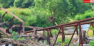 Zniszczony most kolejki wąskotorowej spoczywa w nurcie rzeki