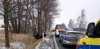 Po tym, jak kierujący Golfem stracił nad nim panowanie, samochód zjechał z drogi, przejechał rów i zatrzymał się na drzewach. Na miejscu straż pożarna, pogotowie i policja.