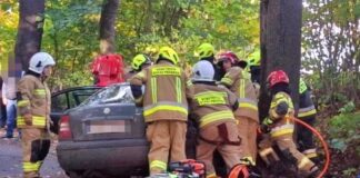 Samochód uderzył w drzewo. Droga jest zablokowana