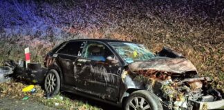 Po tym, jak kierujący Audi stracił nad nim panowanie, samochód wypadł z drogi, dachował i ostatecznie auto uderzyło w skarpę. Na miejscu policja, straż pożarna i pogotowie.