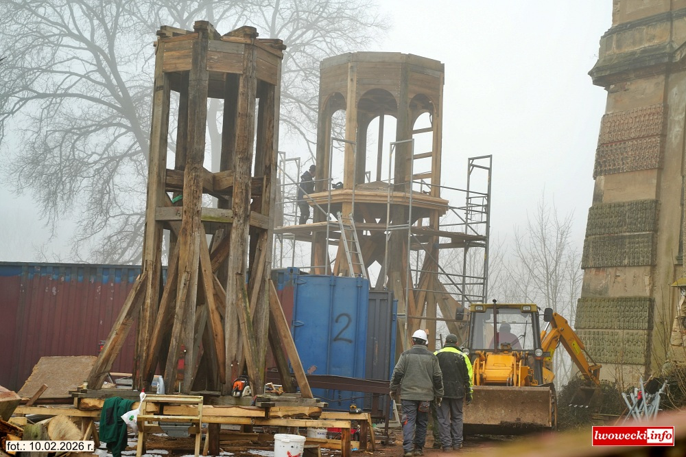 W pierwszej kolejności wykonawca zdemontował górny hełm wieży. W warunkach warsztatowych prowadzona została rekonstrukcja konstrukcji nośnej, w tym naprawa słupów, czopów i gniazd, uzupełnianie ubytków oraz wykonanie nowych krzyżaków. Elementy konstrukcji montowane są próbnie na gruncie, wraz z zastrzałami, rozpórkami i krokwiami wokół dolnego krzyżaka, co pozwala na precyzyjne dopasowanie całości przed ponownym osadzeniem na wieży.