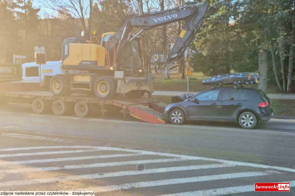 Jak relacjonują czytelnicy, do zdarzenia doszło w chwili, gdy koparka zjeżdżała z lawety. Na szczęście poza uszkodzeniami pojazdów nikomu nic się nie stało.