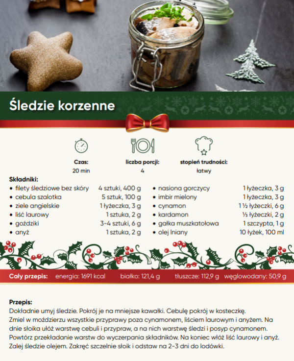 W e-booku „Ryby na świątecznym stole”, który bezpłatnie pobierzemy z portalu diety.nfz.gov.pl znajdziemy 11 propozycji wigilijnych i bożonarodzeniowych potraw rybnych. Znajdują się tam zarówno przepisy tradycyjne jak pieczony karp, śledzie czy zupa rybna, a także pomysły na potrawy nieco nowocześniejsze. Pasta z makreli i pieczarek, sałatka z grillowanym halibutem czy rolada z wędzonym łososiem to dania, które pomogą urozmaicić świąteczny stół. Każdy przepis zawiera szczegółowe dane na temat ilości składników, sposobu i czasu ich przyrządzenia, stopnia trudności oraz wartości energetycznych.