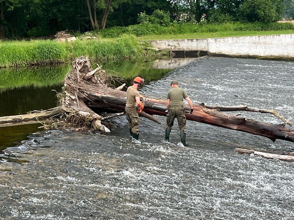 – Jak przyjechali żołnierze, to z inicjatywy pani starosty zorganizowane zostało spotkanie, na które zaprosiliśmy wszystkich zainteresowanych, czyli zarządcę rzeki Wody Polskie i Gminę Lwówek Śląski. Każda z instytucji ma swoje zadanie. My jako koordynator bierzemy na siebie utrzymanie wojska i kierowanie akcją. Rolą Wód Polskich było, po pierwsze udzielenie pozwolenia na wejście na teren, ale także utylizacja tych kłód, które wyciągane są na przyległe łąki i pola, na których są dziś uprawy. Natomiast zadaniem burmistrz Lwówka Śląskiego jest ustalanie właścicieli działek i rozmowa z tymi właścicielami, żeby wojsko mogło na dany teren bez problemu wejść. – wskazuje Łukasz Strzelecki.